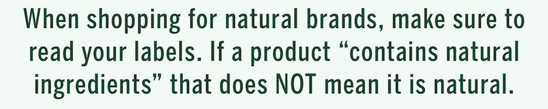 When shopping for natural brands, make sure to read your labels. If a product “contains natural ingredients” that does NOT mean it is natural. Most ingredients, at some point in their life cycle, could be considered “natural” by someone. Remember, the word “natural” isn’t regulated. This is a common marketing trick you can avoid by simply reading the entire label, and not just the front product copy.